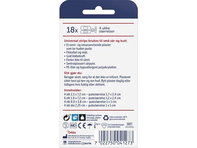 "Hudvennlige universalstrips fra Norgesplaster® i 4 ulike størrelser Disse vannavstøtende og pustende universalstripsene er perfekte for små kutt, sår og rifter. Plasteret har god klebekraft og en sårpute som ikke fester seg i såret. Polyacrylatlimet er allergitestet og hudvennlig. Universalstripsene er fine å ha i medisinskapet dersom uhellet skulle være ute, og pakken inneholder plaster i 4 ulike størrelser. Plaster til små kutt, sår og rifter Vannavstøtende og pustende Antall i pakken: 18 stk 25 x 70 mm: 5 stk 20 x 70 mm: 5 stk 10 x 40 mm: 4 stk Diameter på 23 mm: 4 stk Hudvennlig polyacrylat lim Microperforert PE-film"
