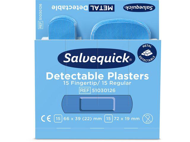 "Salvequick Blue Detectable plaster er spesielt beregnet for bruk i næringsmiddelindustrien. Plastrene er detekterbare og oppdages av de fleste metalldetektorer. Den blå fargen gjør at plasteret også er lett å oppdage visuelt. Plastrene er allergitestet. De er lette å sette på, og fleksible og smidige i bruk. Rengjør såret, sørg for at det ikke er infiser og skift plaster hver dag. Høy kvalitet Allergitestet Smidige og lette å bruke Hver refill inneholder 30 plastre (15 stk 63×39 (22) mm og 15 stk 72×19 mm)"